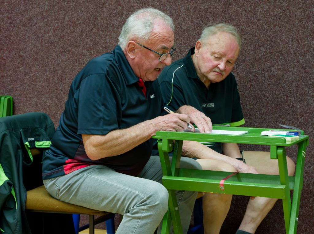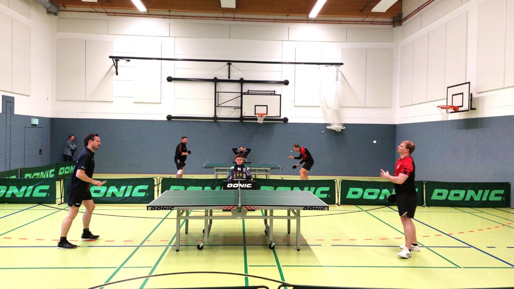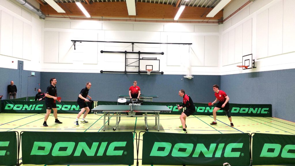 Luca musste gegen Tino Jablinski den ersten Satz abgeben, fing sich danach aber und fand immer besser ins Spiel. Erst der Satzgewinn zum Ausgleich, dann zur Führung und schlussendlich zum 3:1-Sieg. Simon unterlag am Nachbartisch Patrick Latiszew mit 1:3. Benni fand gegen Nick Geyer nicht wirklich in sein Spiel und unterlag ebenfalls 1:3. Maxi führte gegen Stefan Richmann bereits 2:0, kassierte dann aber mit einem 14:16 in Satz drei den Anschluss. Im vierten Satz machte unsere Nummer vier dann aber wieder vieles richtig und ging unterm Strich mit 3:1 als Sieger vom Tisch. Nico unterlag indes Anton Förster mit 0:3. Es stand also nunmehr 7:7 und Tilo hatte die „Ehre“, darüber zu entscheiden, ob es mit einem Vorsprung oder einem Rückstand ins Entscheidungsdoppel ging. Es war also ein bisschen Druck auf dem letzten Spiel. Die Nummer eins unserer zweiten Mannschaft ließ sich davon aber nichts anmerken – und das, obwohl ihn akute Rückenprobleme plagten, die aber durch unsere qualifizierte Physiotherapeutin spontan behandelt wurden. Das ganze scheint gewirkt zu haben. Tilo entschied alle drei Sätze für sich und ging mit 3:0 als Sieger vom Tisch.